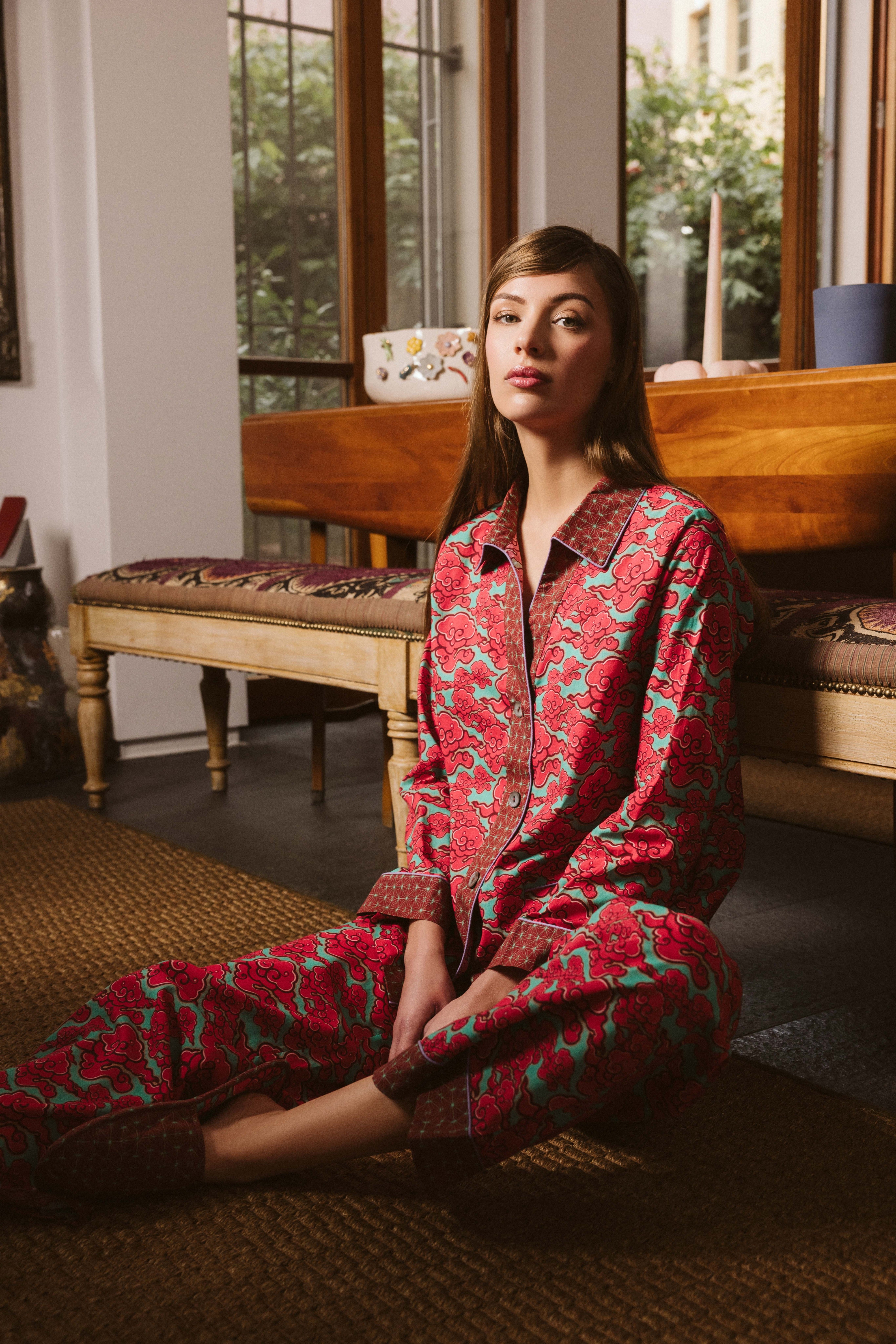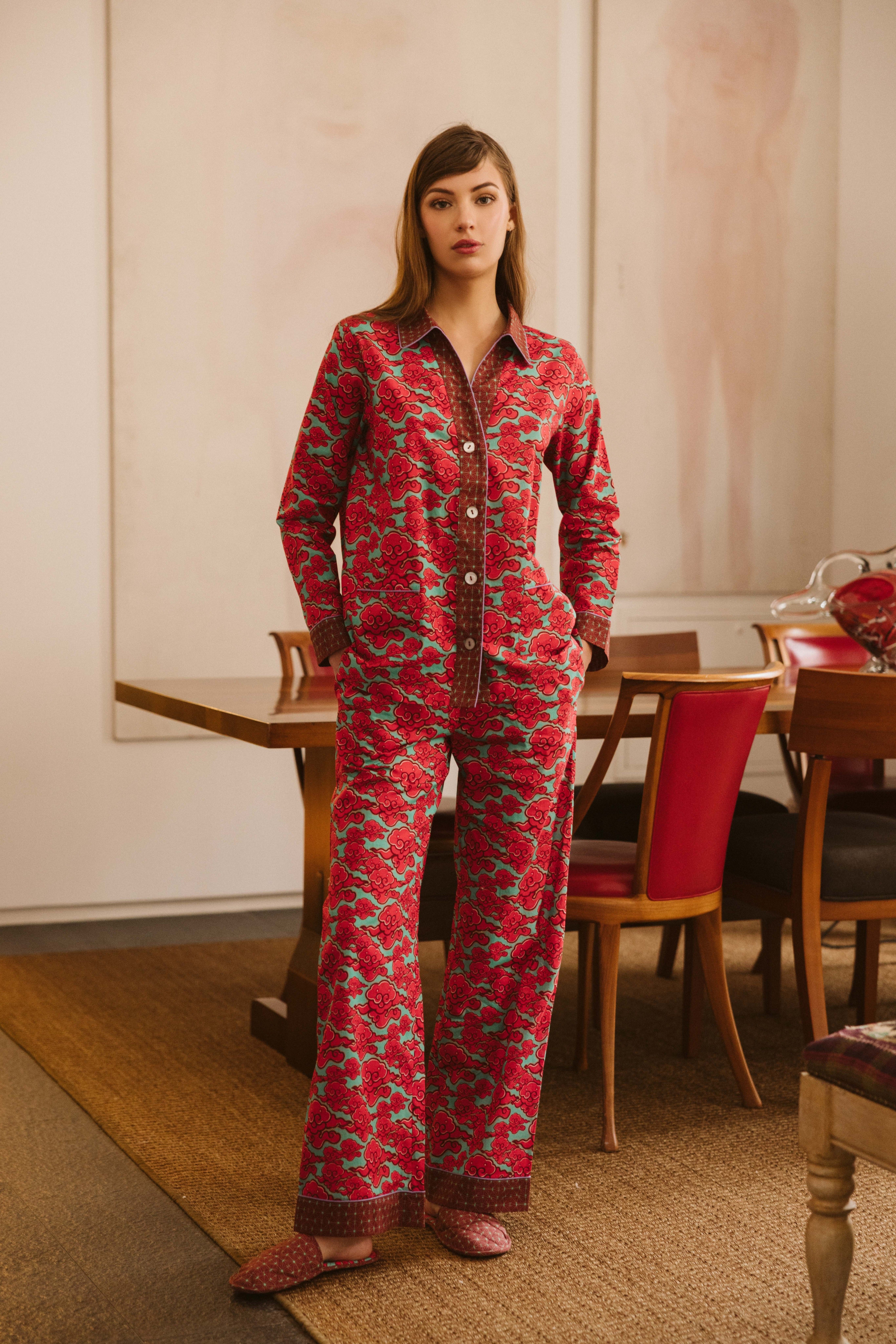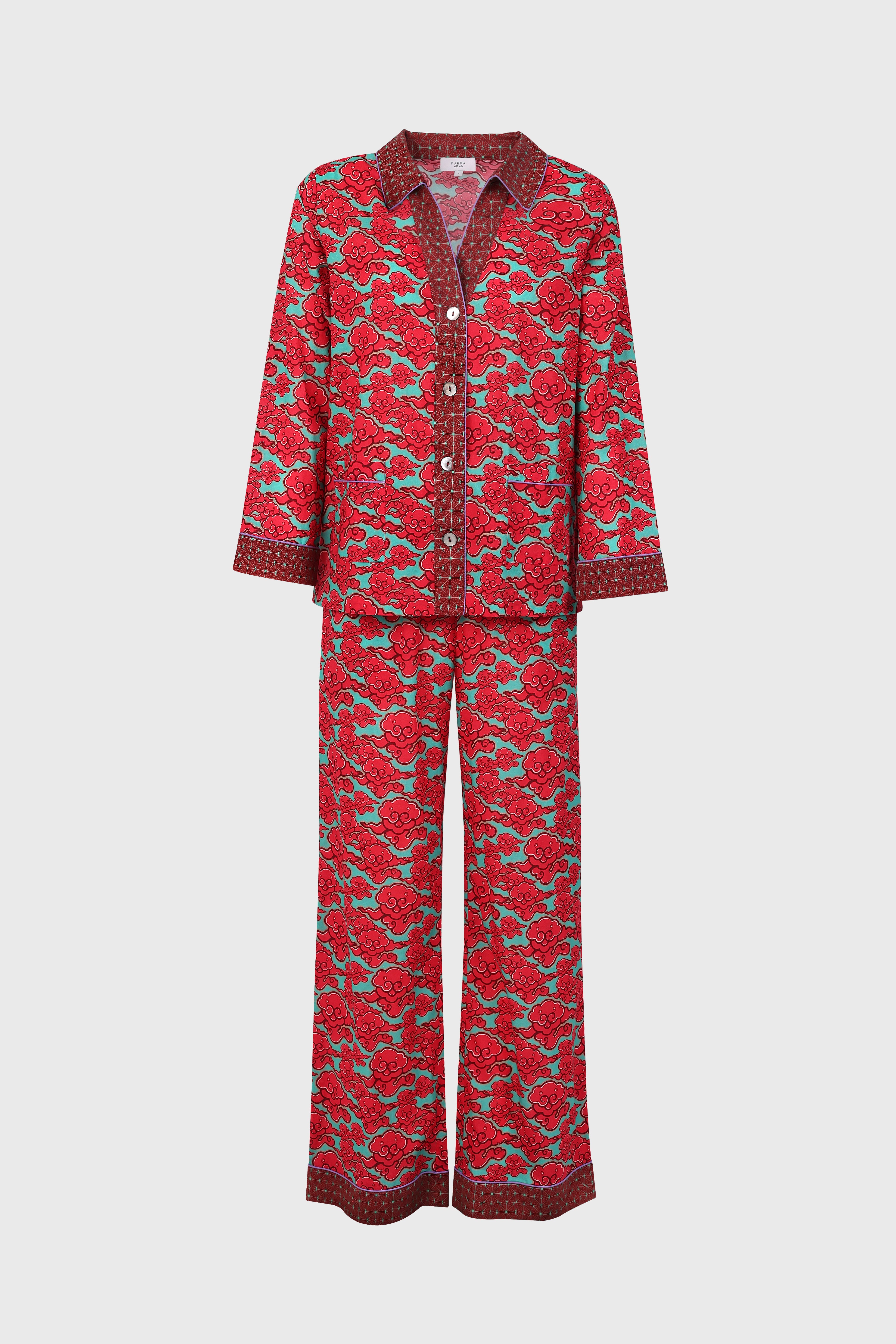 Tokyo Pyjama is crafted from soft, breathable 100% cotton and finished with mother-of-pearl buttons for a touch of quiet refinement. With a classic shirt collar, long sleeves, and a striking statement print, it balances ease with sophistication. Perfectly co-ordinated for lounging at home or styled as a chic set beyond the house, it offers effortless elegance in every detail.