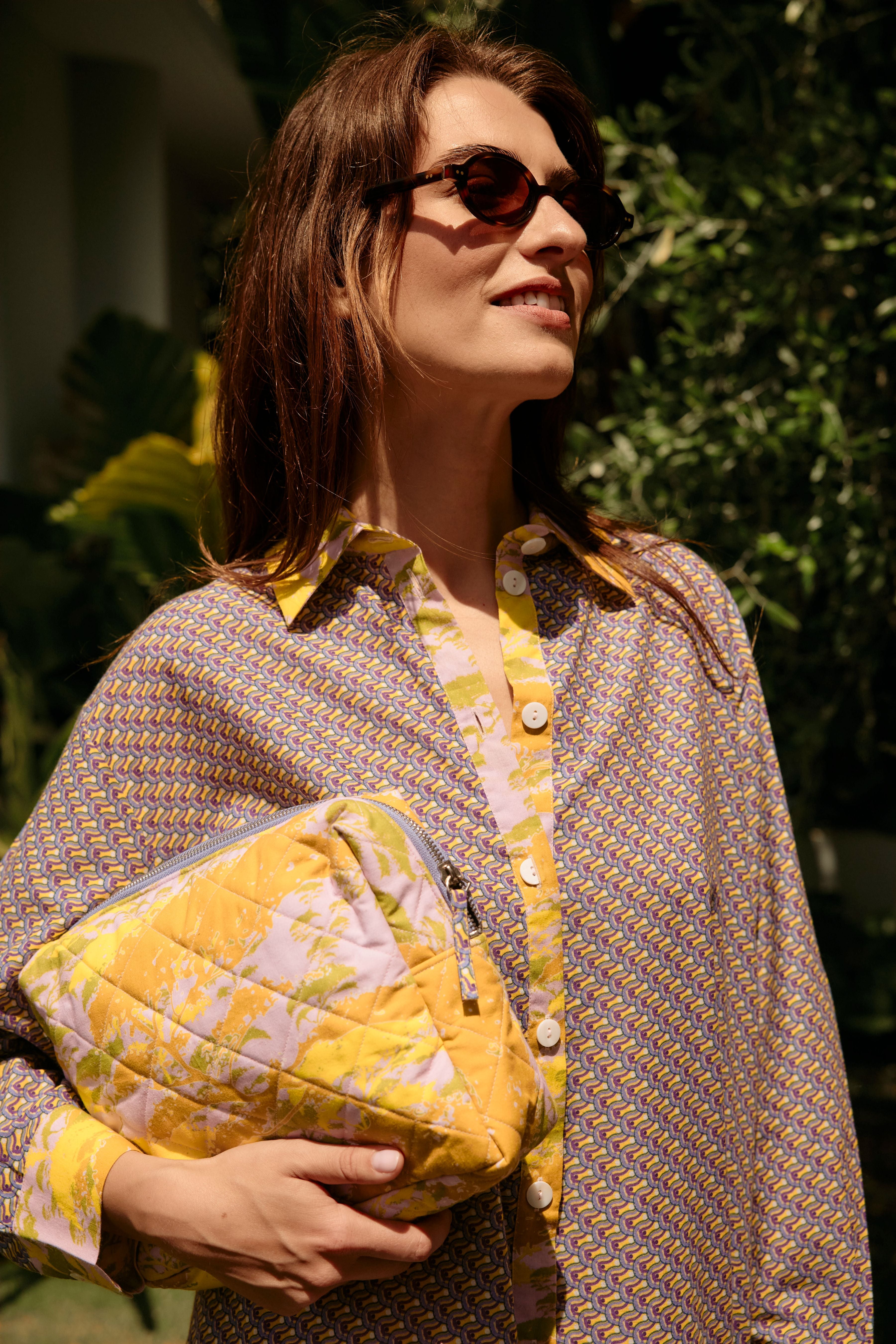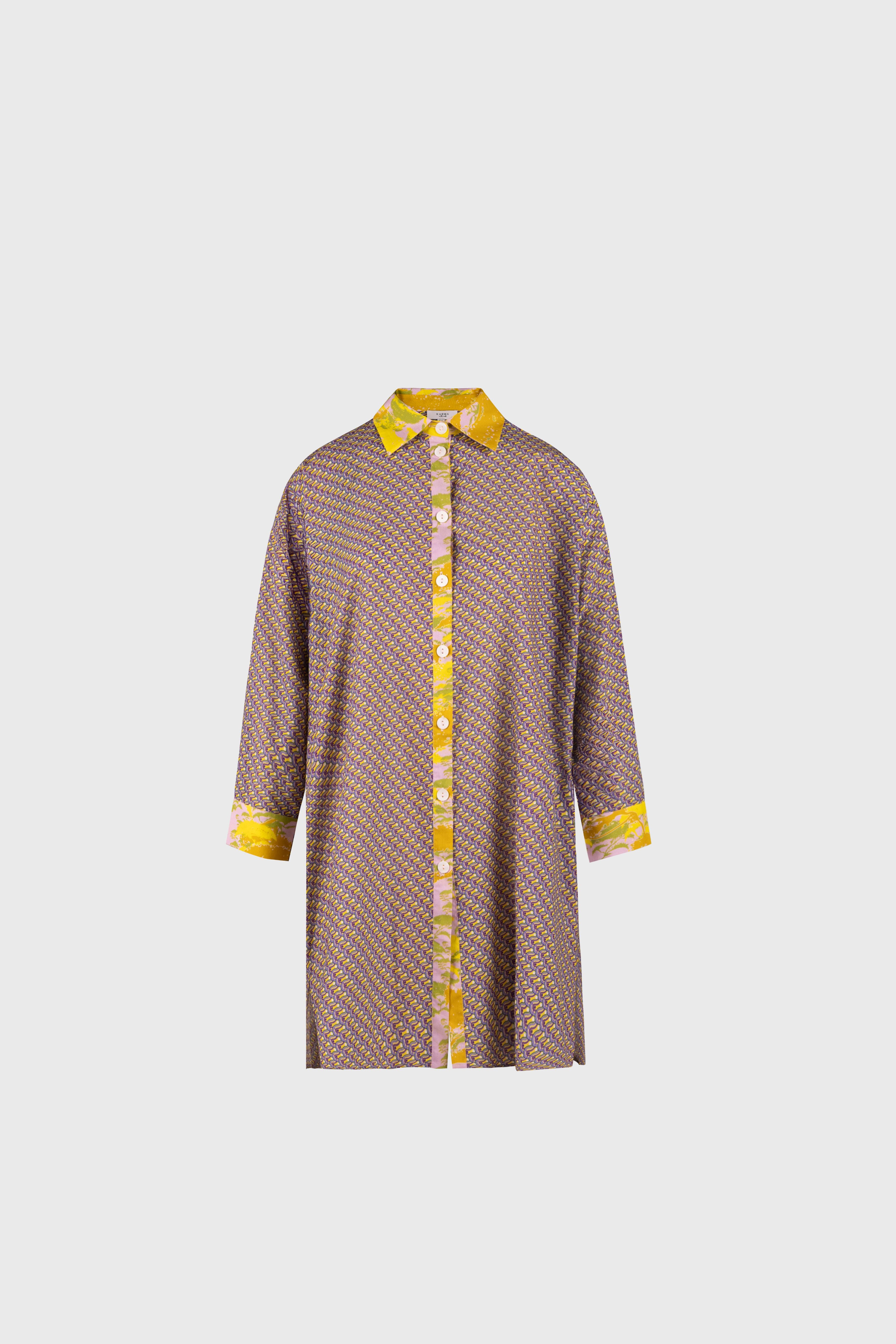 Deep plum, offset by vivid yellow traces the collar, cuffs of the sleeves and the front placket, reflecting the brand’s signature interplay of the main print with a contrasting pattern. The oversized silhouette flows with ease, while the button-down front, cuffed sleeves and a longer hem create a polished shape. Wear on its own for relaxed moments at home, or layer and style with your favourite summer looks.