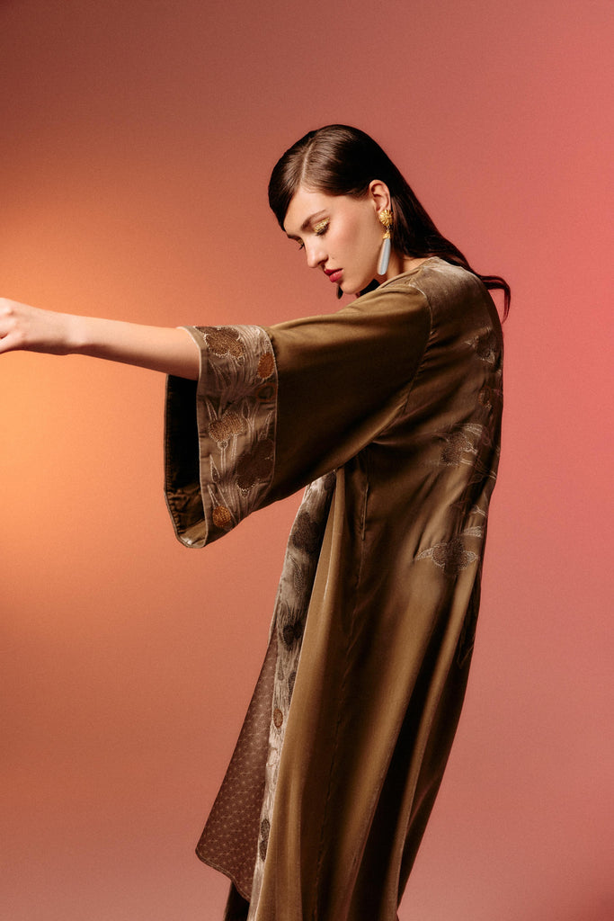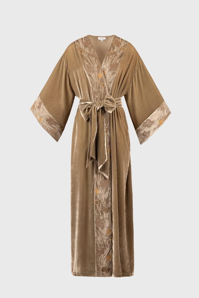 The Kobe Kimono is crafted from indulgent velvet, soft to the touch and rich in colour. Intricate embroidery adds an air of timeless elegance extreme luxury and thoughtful craftsmanship, making it perfect for both quiet moments and glamorous nights out. It comes with a sumptuous belt, allowing you to style it with or without, for a truly personalised look. A one-of-a-kind of piece that elevates your wardrobe entirely.