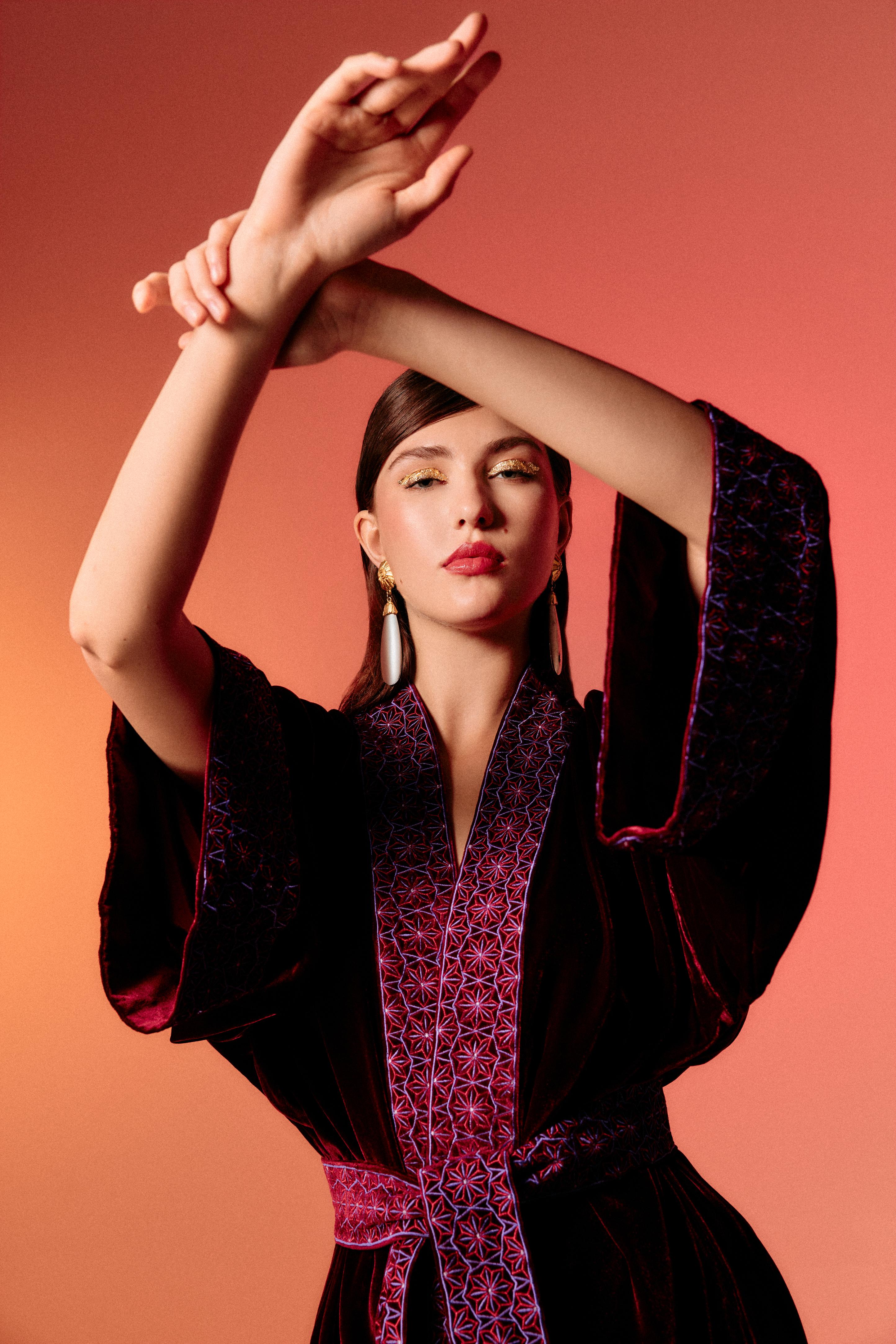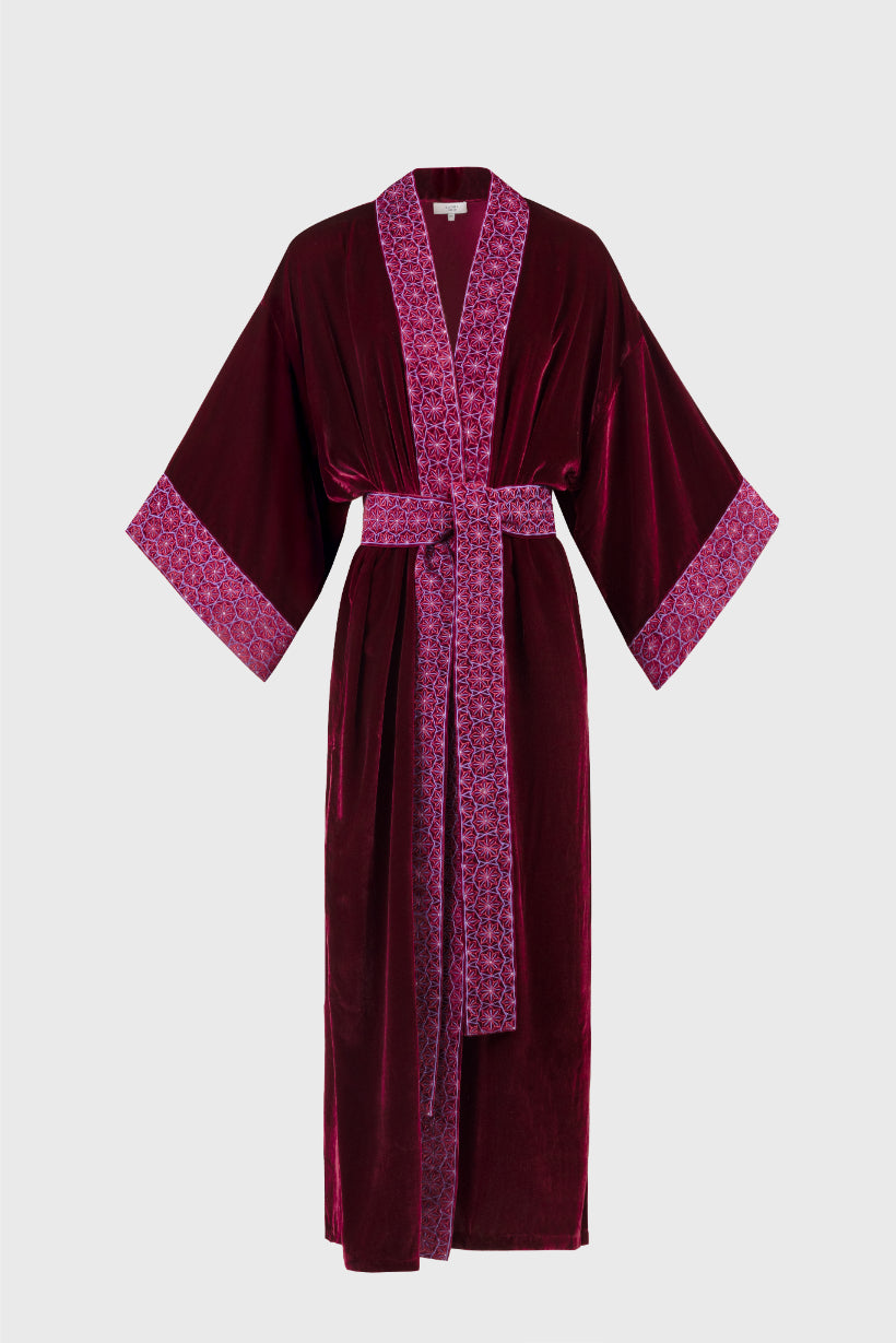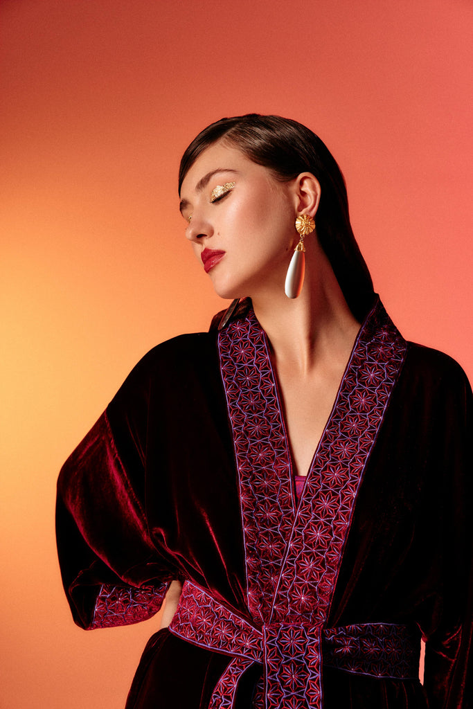 The Nikko Long Kimono is crafted from indulgent velvet, soft to the touch and rich in colour. Intricate embroidery adds an air of timeless elegance extreme luxury and thoughtful craftsmanship, making it perfect for both quiet moments and glamorous nights out. It comes with a sleek belt, allowing you to style it with or without, for a truly personalised look. A one-of-a-kind of piece that elevate your wardrobe entirely.