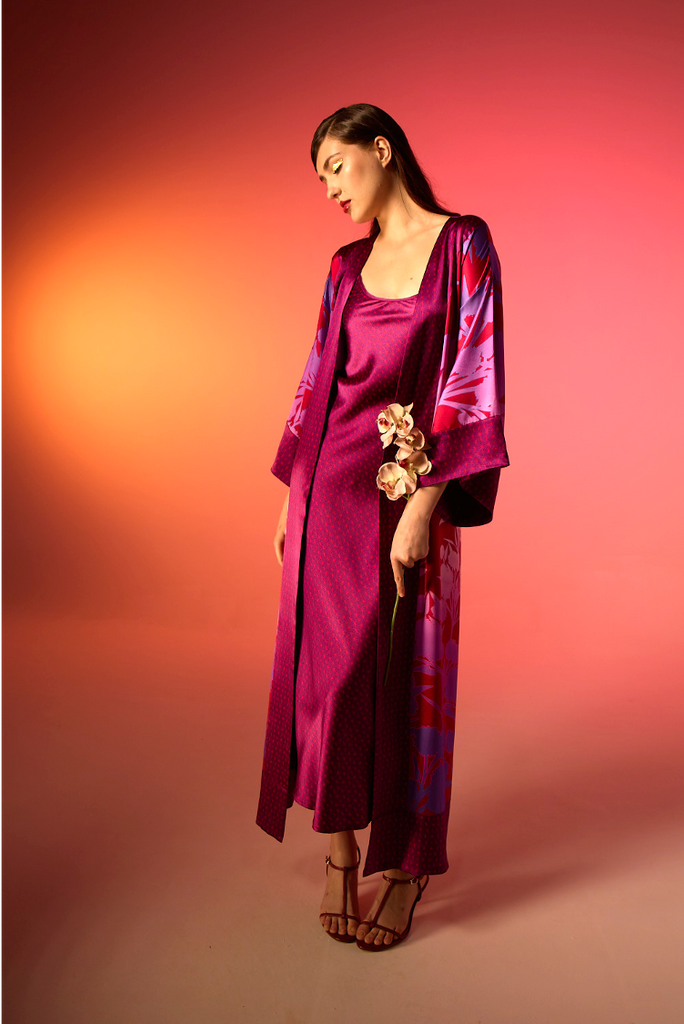 The long Kobe Kimono is crafted from soft 100% silk and adorned with a striking print that makes an effortless statement. Designed with a large detachable belt for a personalised fit, it moves with ease from relaxed mornings to elegant evenings. Wear it as a chic layer over our Edo Slip Dress, or style it on its own for an effortlessly refined look.