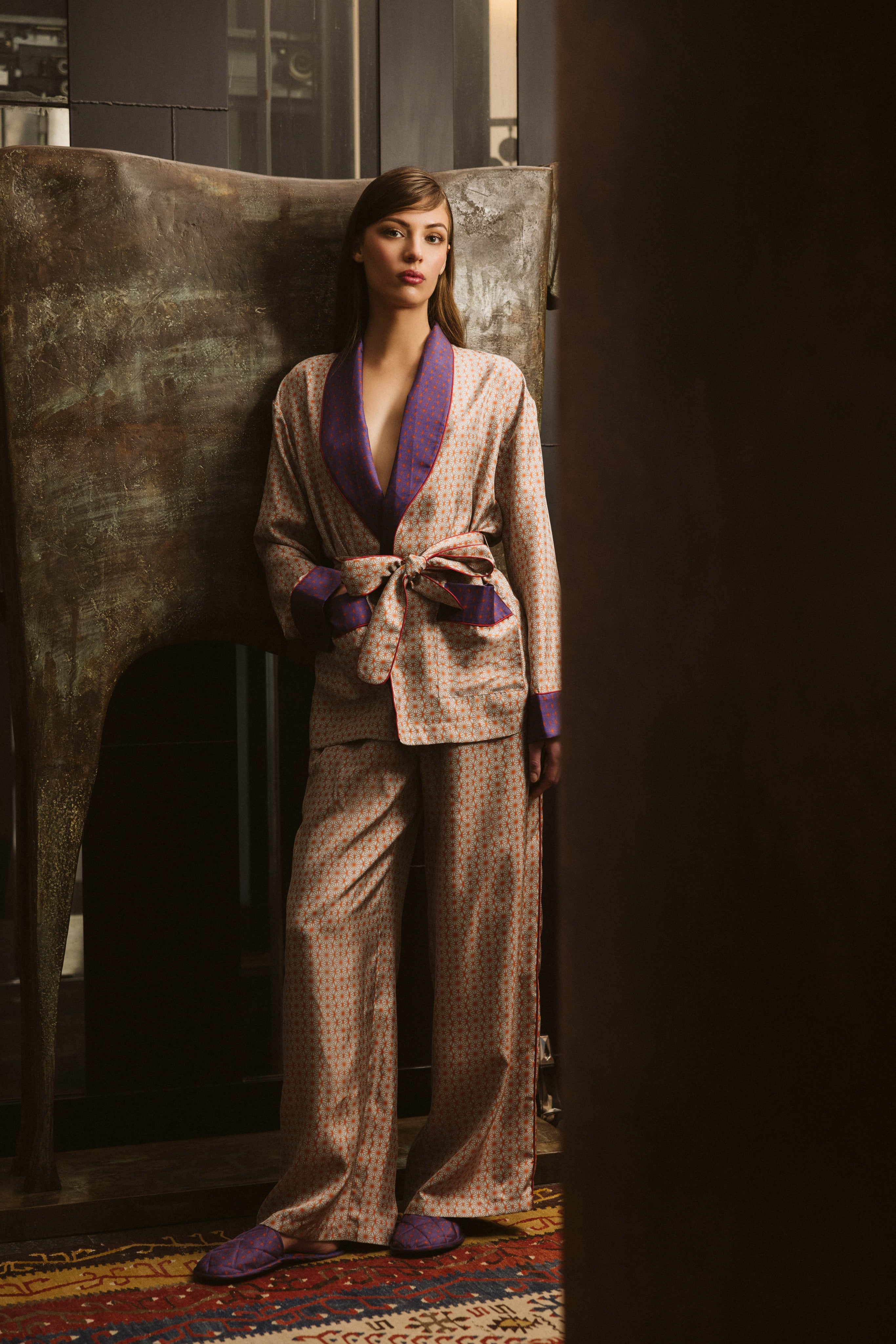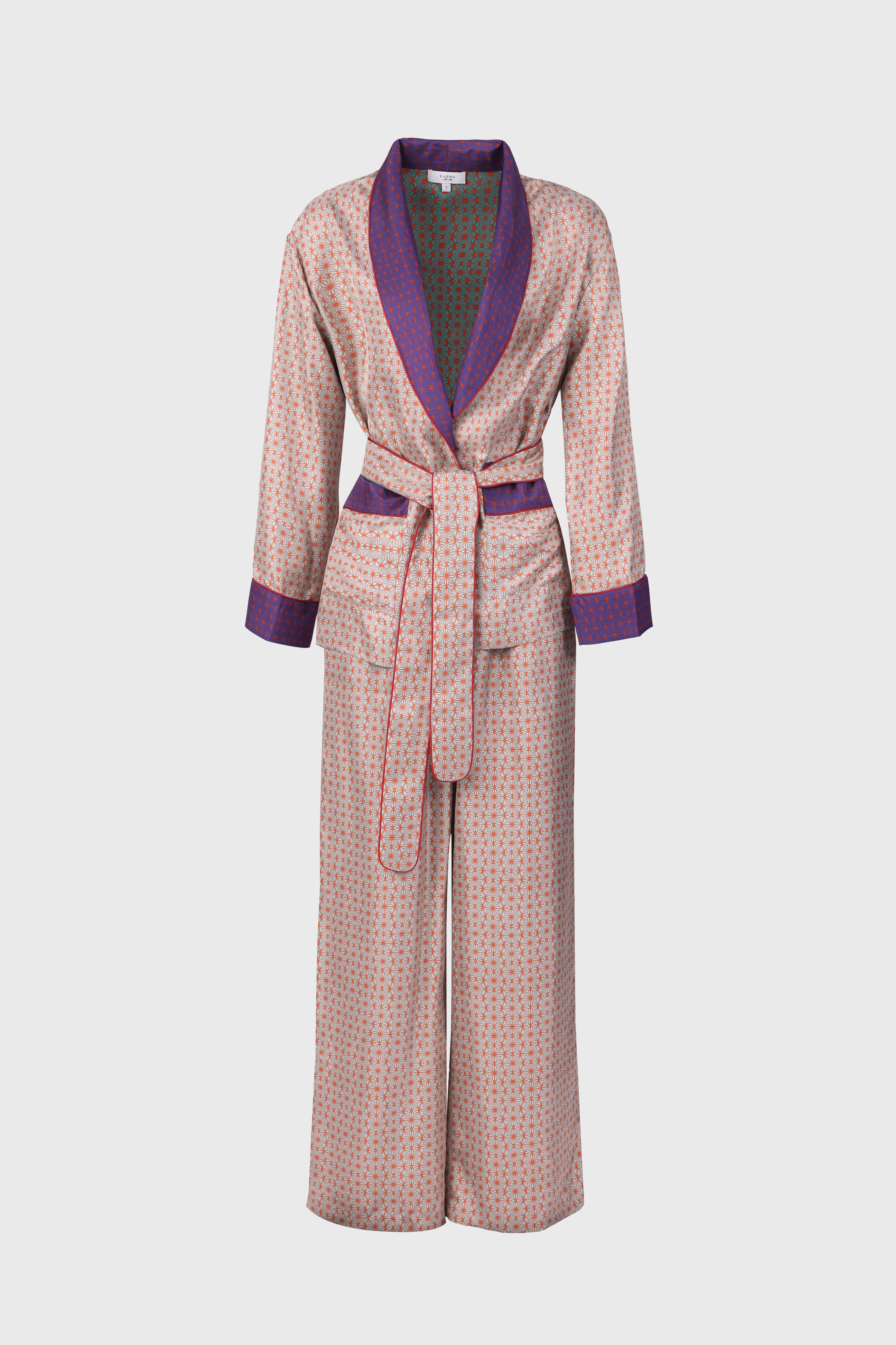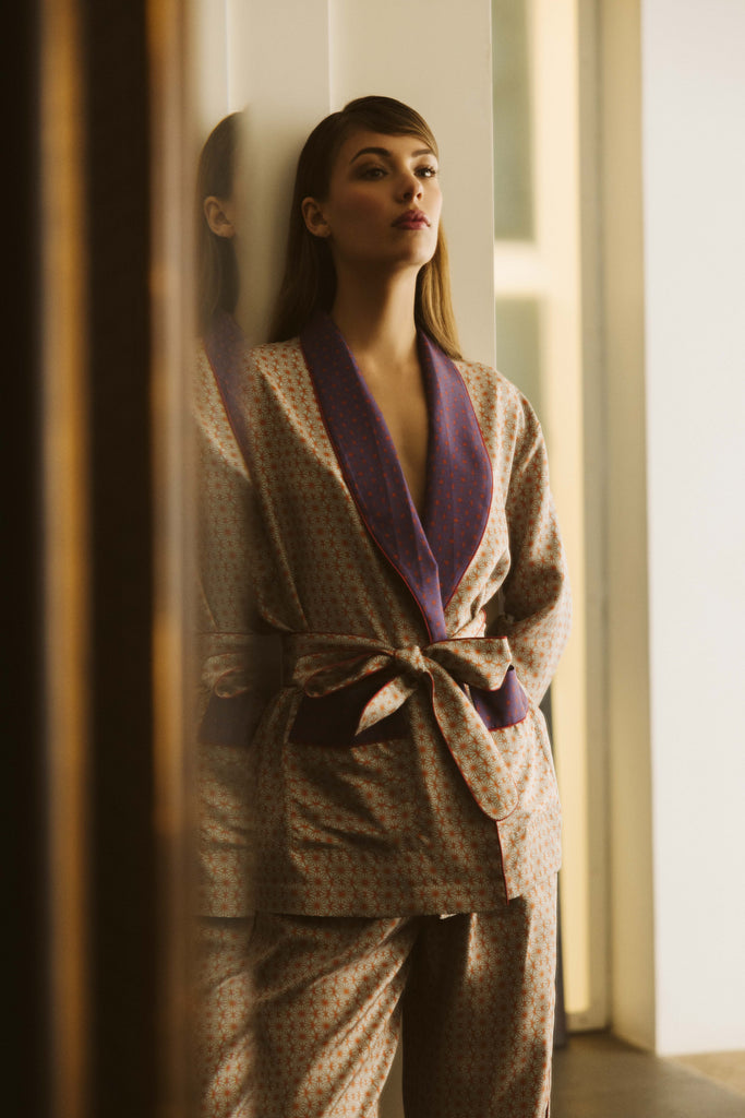 The Ari Pyjama is defined by its full-length sleeves and a luxurious shawl collar, creating a silhouette of effortless refinement. Finished with a detachable belt for a cinched or relaxed fit, it is as suited to indulgent moments at home as it is to stepping out in style. With its sophisticated print, the Ari is chic, versatile, and unapologetically elegant.