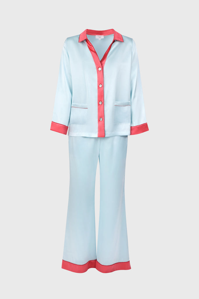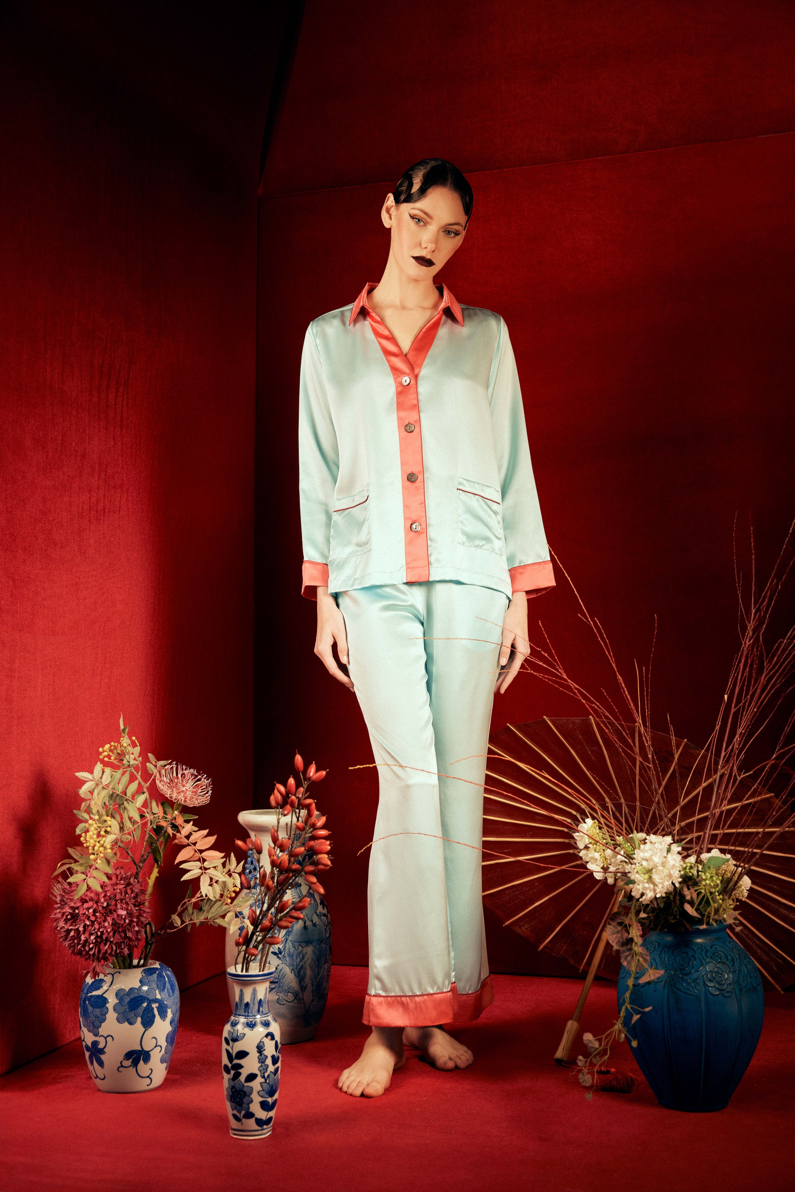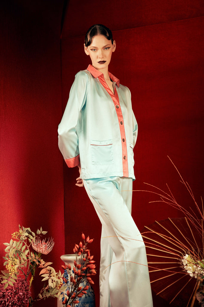 Tokyo Pyjama is crafted from soft, breathable 100% silk and finished with mother-of-pearl buttons for a touch of quiet refinement. With a classic shirt collar, long sleeves, and a striking statement print, it balances ease with sophistication. Perfectly co-ordinated for lounging at home or styled as a chic set beyond the house, it offers effortless elegance in every detail.