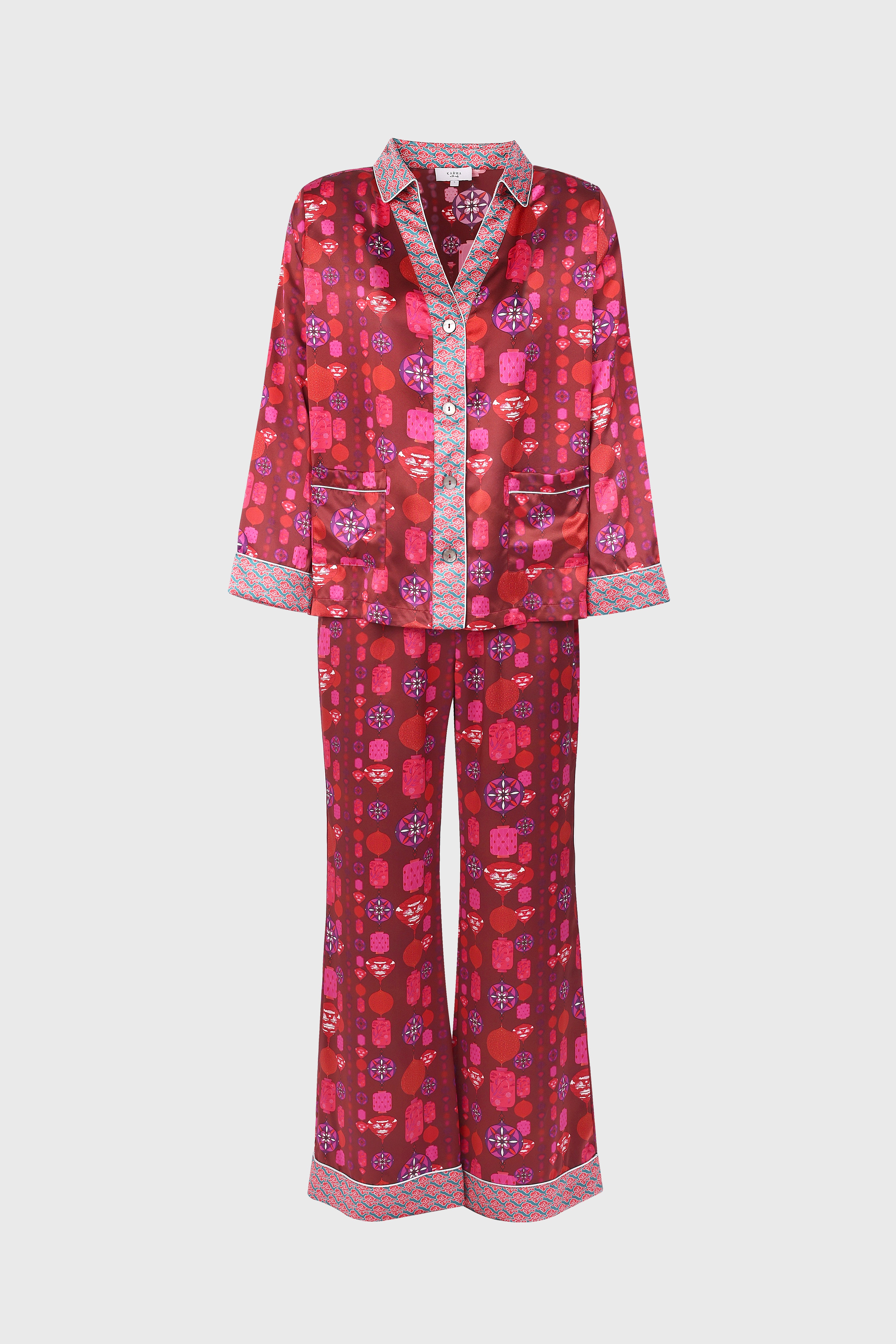 Tokyo Pyjama is crafted from soft, breathable 100% silk and finished with mother-of-pearl buttons for a touch of quiet refinement. With a classic shirt collar, long sleeves, and a striking statement print, it balances ease with sophistication. Perfectly co-ordinated for lounging at home or styled as a chic set beyond the house, it offers effortless elegance in every detail.