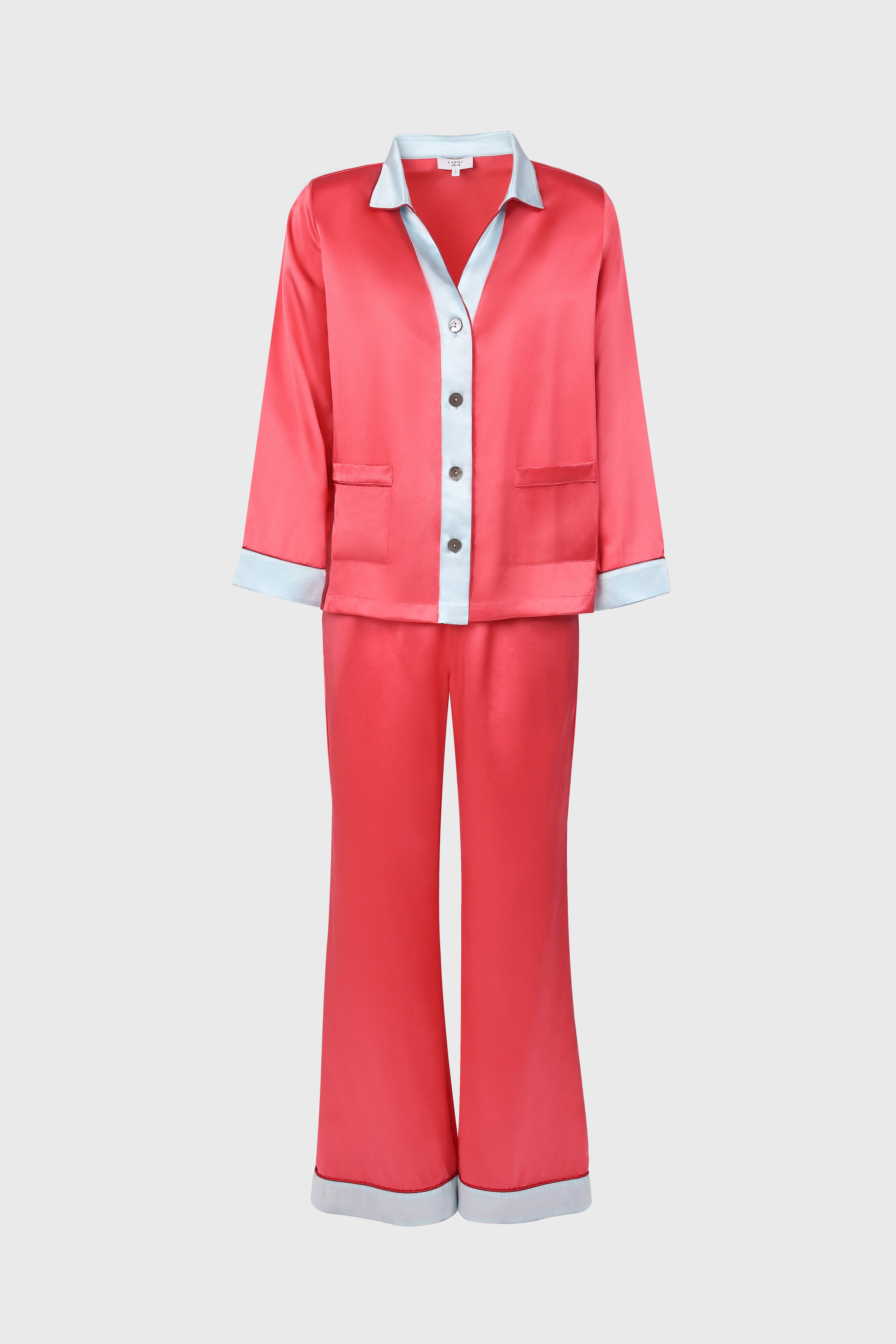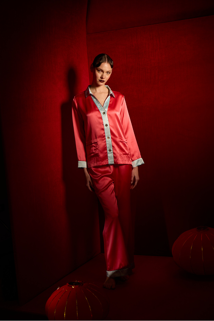 Tokyo Pyjama is crafted from soft, breathable 100% silk and finished with mother-of-pearl buttons for a touch of quiet refinement. With a classic shirt collar, long sleeves, and a striking statement print, it balances ease with sophistication. Perfectly co-ordinated for lounging at home or styled as a chic set beyond the house, it offers effortless elegance in every detail.