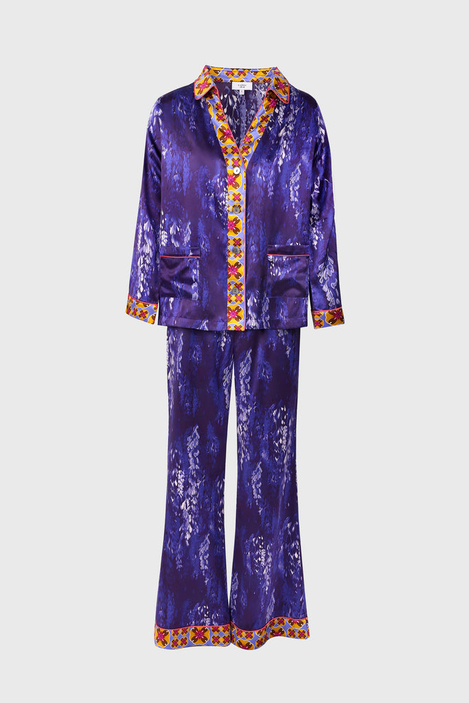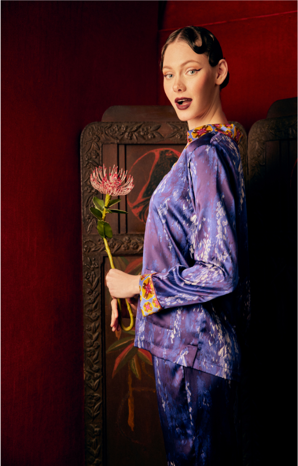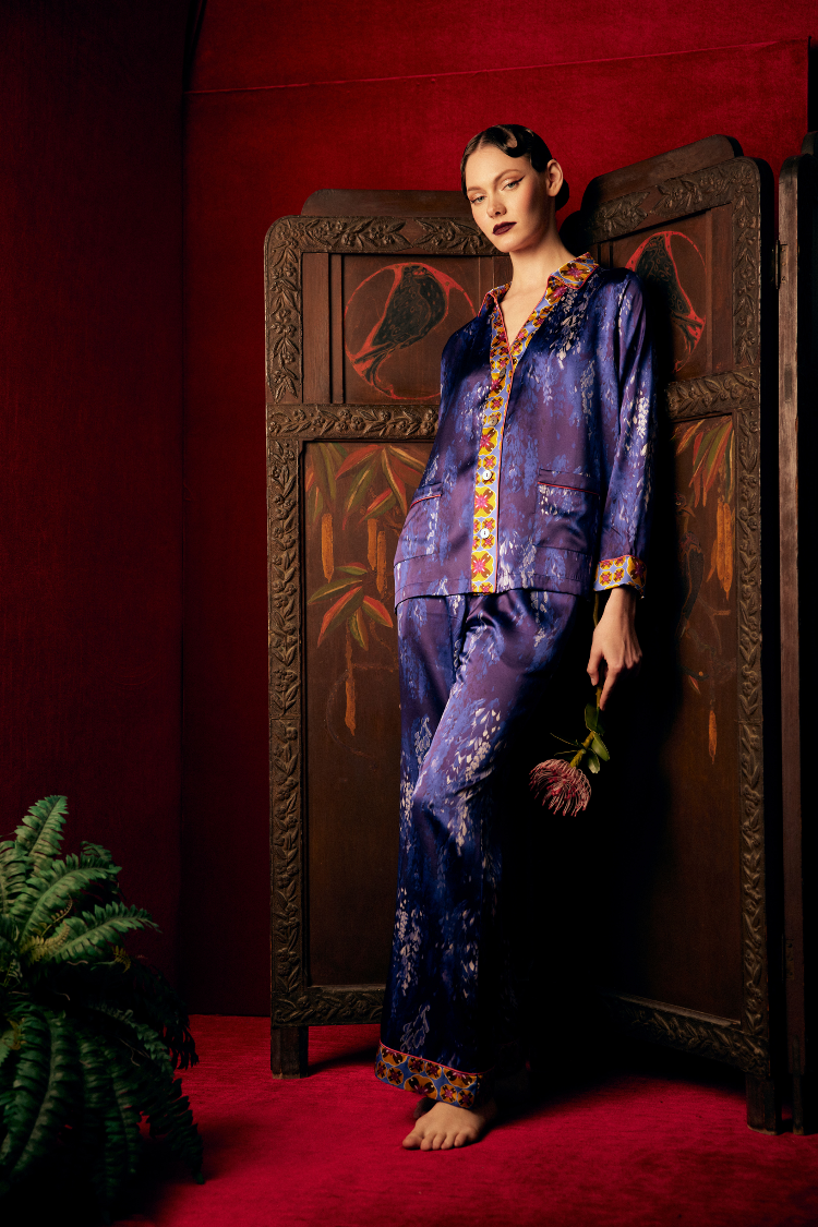Tokyo Pyjama is crafted from soft, breathable 100% silk and finished with mother-of-pearl buttons for a touch of quiet refinement. With a classic shirt collar, long sleeves, and a striking statement print, it balances ease with sophistication. Perfectly co-ordinated for lounging at home or styled as a chic set beyond the house, it offers effortless elegance in every detail.