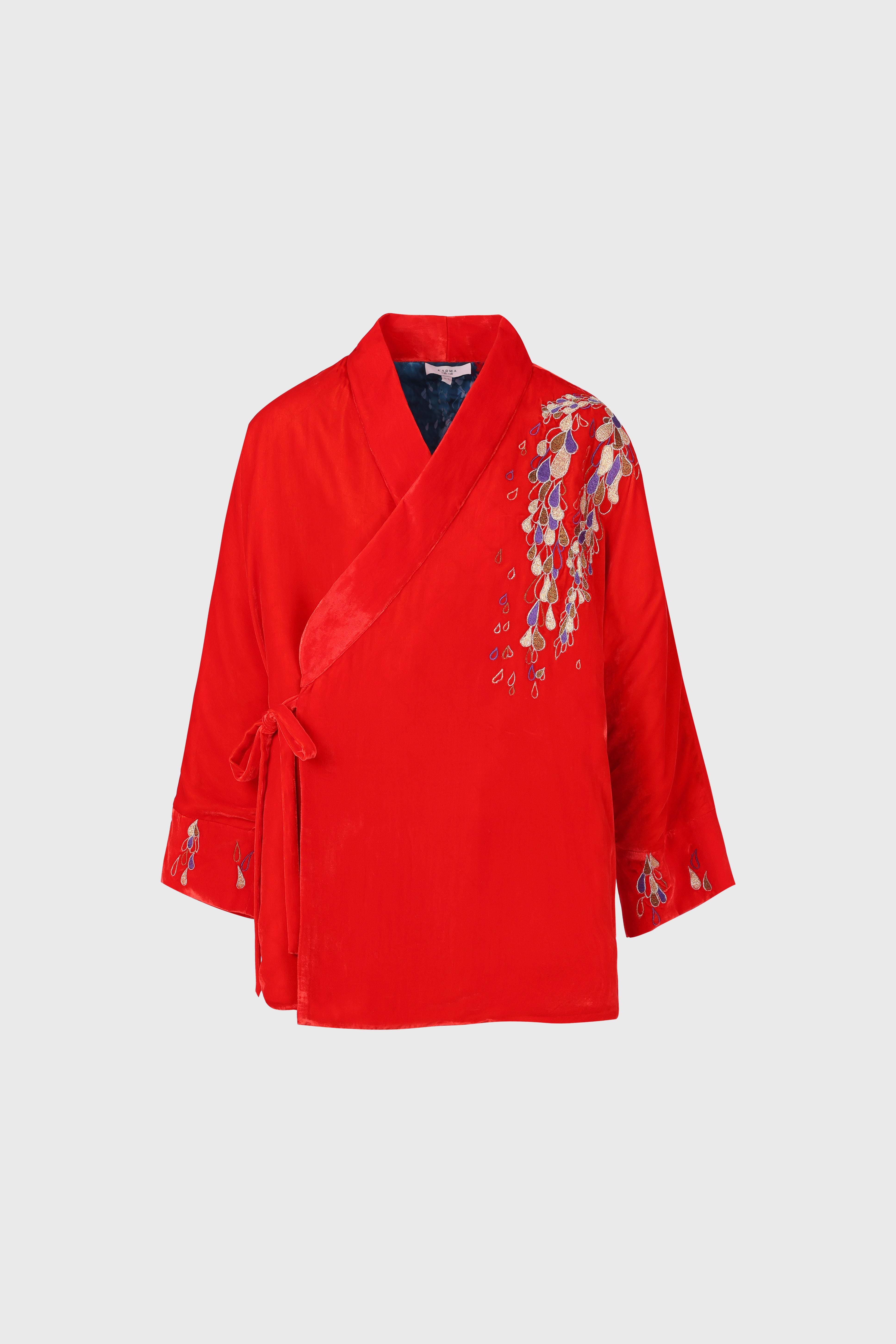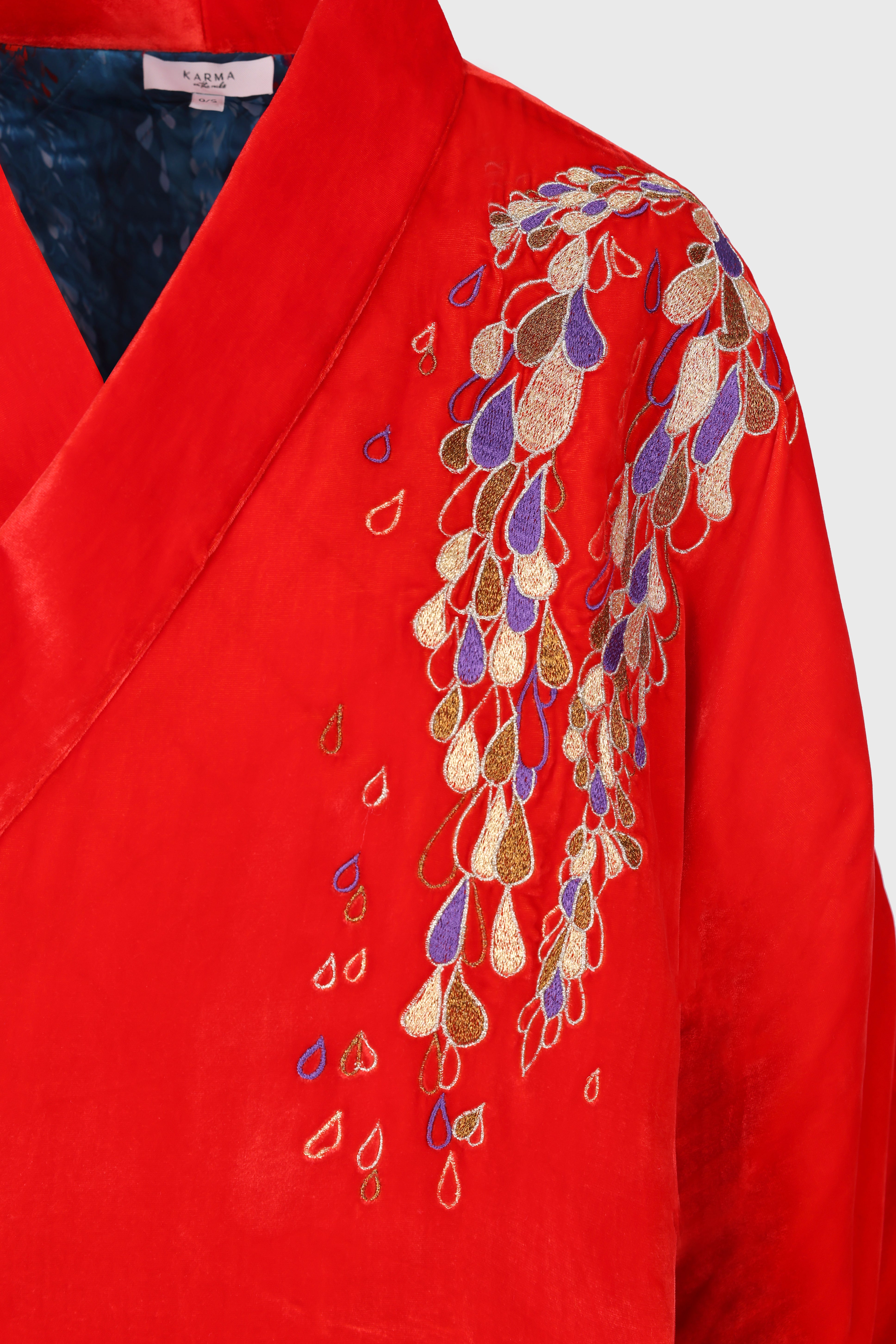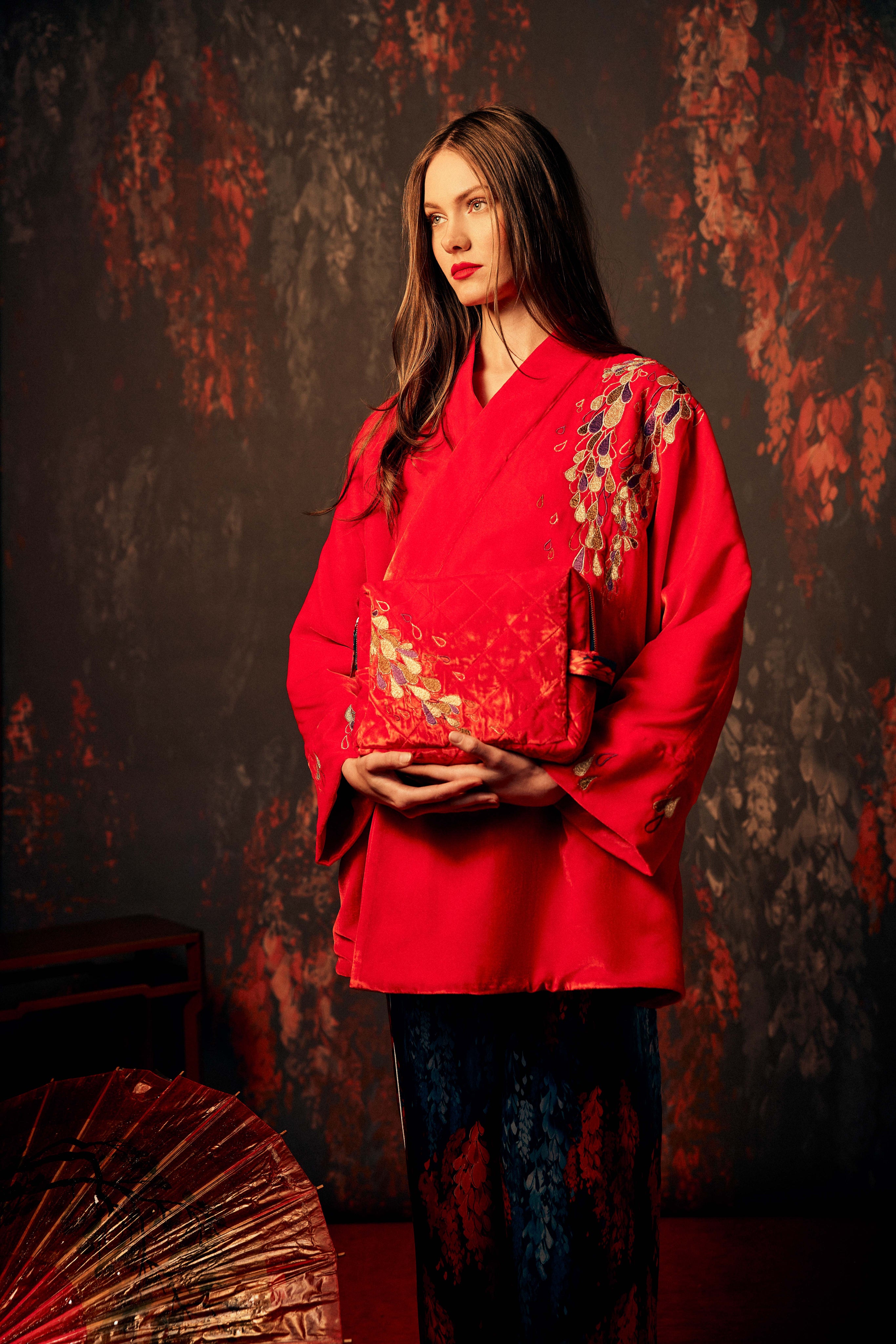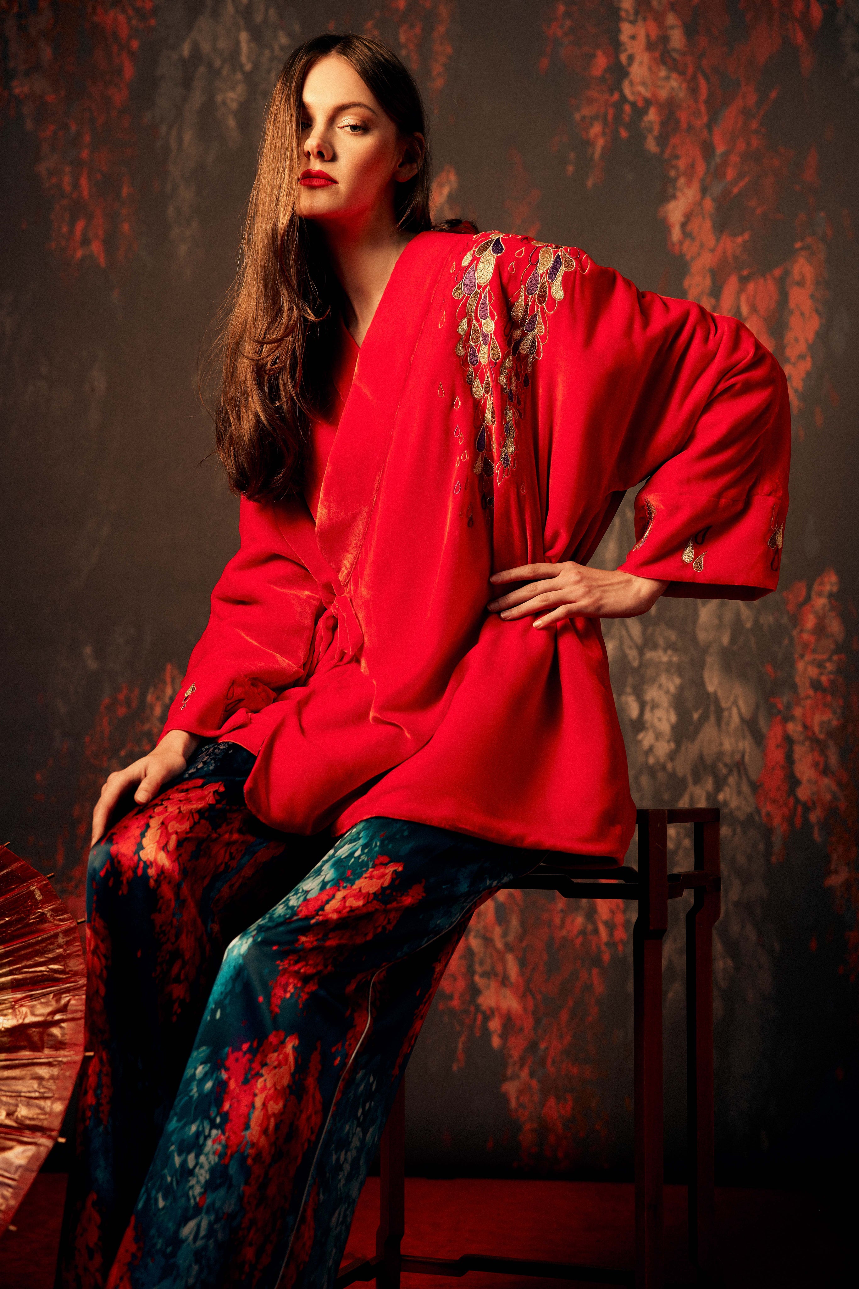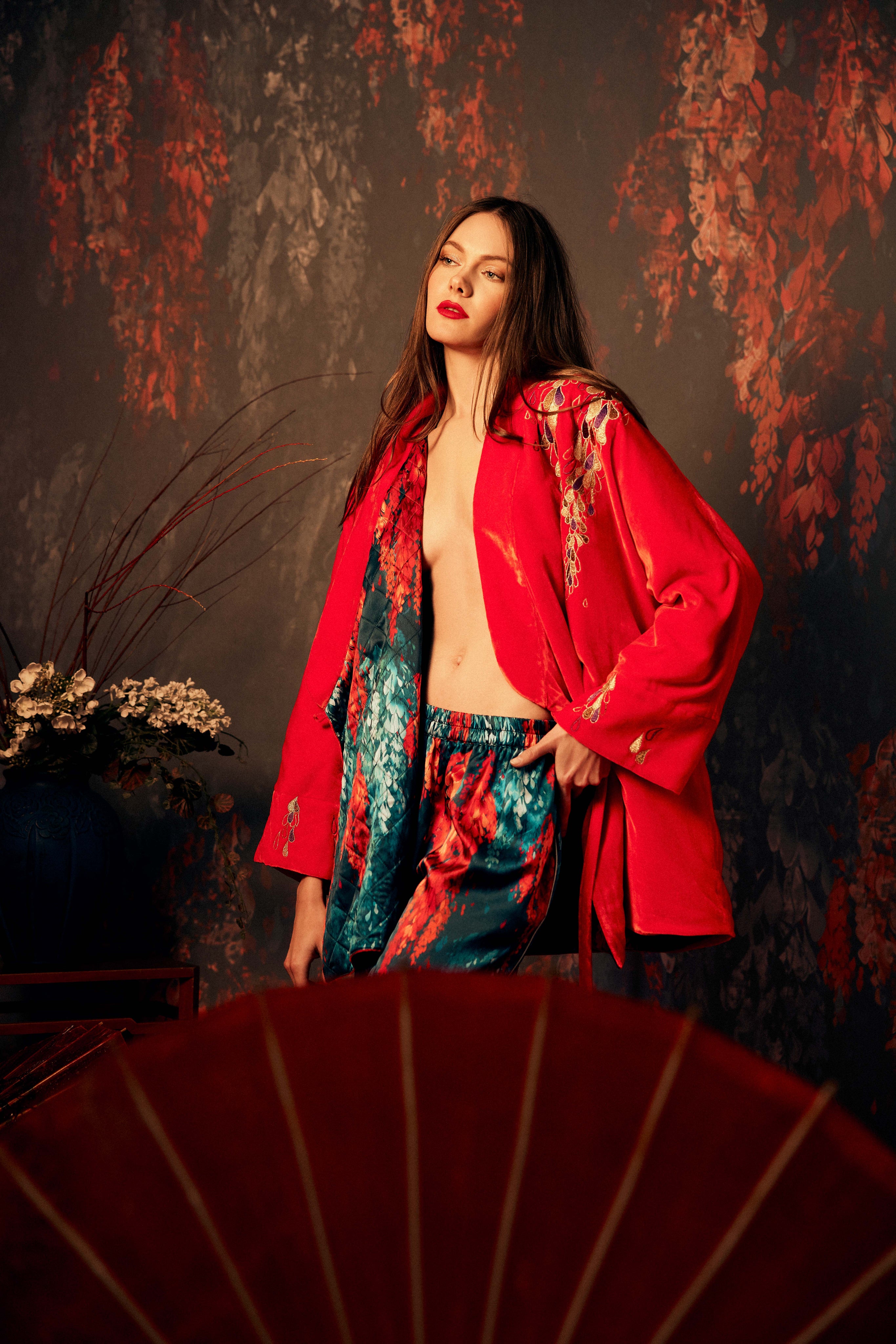 The Hanten Jacket is crafted from sumptuous velvet, adorned with exquisite embroidery and finished with subtle shoulder padding for a refined silhouette. A sleek side tie adds a luxe touch, elevating every detail. Wear it over our Edo and Gifu dresses, velvet or silk Isa or Tokyo Trousers or even layered with lingerie or denim, effortlessly turning heads wherever you go. A statement piece that blends craftsmanship, sophistication, and glamour in perfect harmony.