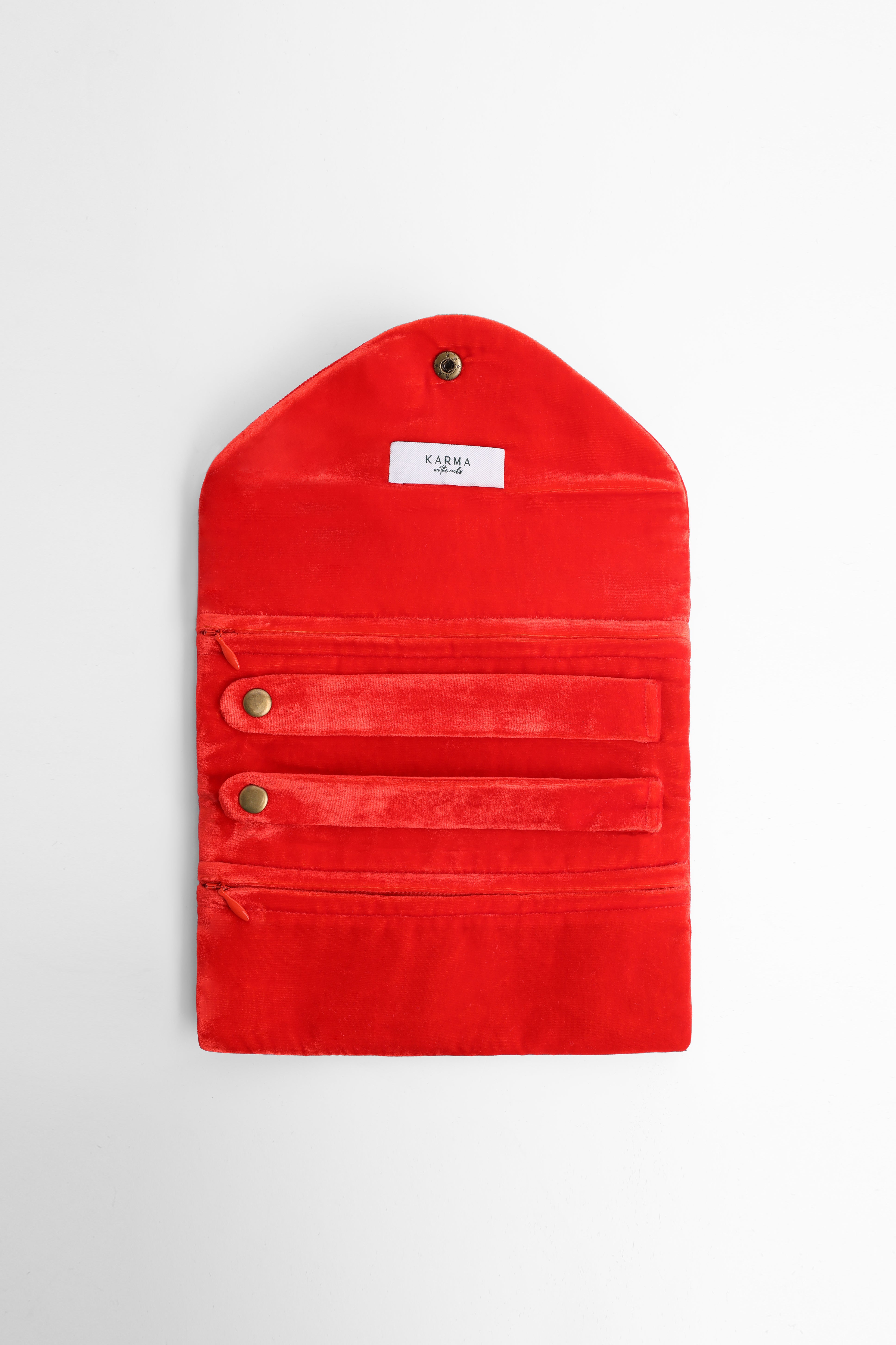 Unroll a touch of luxury with our embroidered velvet Jewellery Pouch. Thoughtfully designed compartments and pockets keep your jewels and cosmetics pristine and protected, while its sumptuous materials and exquisite embroidery make it effortlessly chic. Perfectly glamorous, it transitions seamlessly from day to night, adding a whisper of indulgence wherever you go.