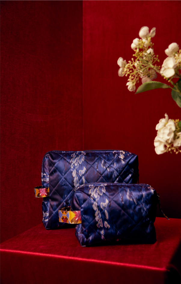 Spacious yet refined, the big pouch is crafted from soft 100% luxurious silk, with a contrasting interior pattern for a discreet touch of charm. Lightly padded to protect and hold its shape, it combines beauty with practicality. Ideal for travel or home, it keeps your make-up, toiletries, or daily essentials elegantly organised, adding a whisper of luxury to every occasion.